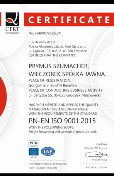 Powierzone nam towary obejmujemy najwyższym staraniem, dlatego wszystkie ładunki przewożone przez firmę Prymus ubezpieczone są w ramach umowy OCP w ruchu krajowym i międzynarodowym w Ergo Hestia do wysokości sumy gwarancyjnej 300 000 EUR. Oprócz tego posiadamy ubezpieczenie kabotażowe na kwotę 600.000 EUR.